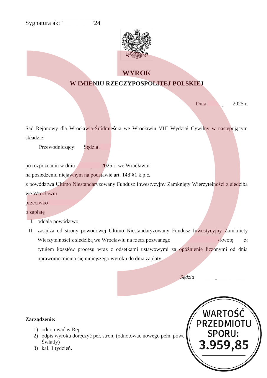 Wielu osobom zadłużonym wydaje się, że sytuacja bez wyjścia to codzienność, a wierzyciel i windykacja zawsze mają rację. Tymczasem rzetelna pomoc przy wyjściu z długów istnieje i każdego dnia udowadniają to sądy w całej Polsce. Dłużnik nie jest bezbronny – ma swoje prawa, które można i trzeba skutecznie egzekwować. Przykładem jest sprawa z powództwa Ultimo Niestandaryzowany Fundusz Inwestycyjny Zamknięty Wierzytelności, gdzie sąd nie tylko oddalił pozew w całości, ale również zasądził zwrot kosztów procesu na rzecz pozwanego. Wartość przedmiotu sporu wynosiła 3.959,85 zł. Dzięki obronie udało się więc całkowicie uniknąć odpowiedzialności finansowej.