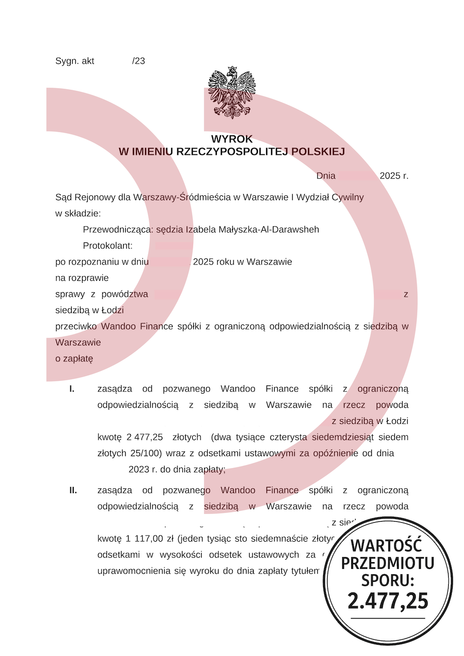 Zasądzono 2.477,25 zł wraz z ustawowymi odsetkami 1.117,00 zł za opóźnienie.