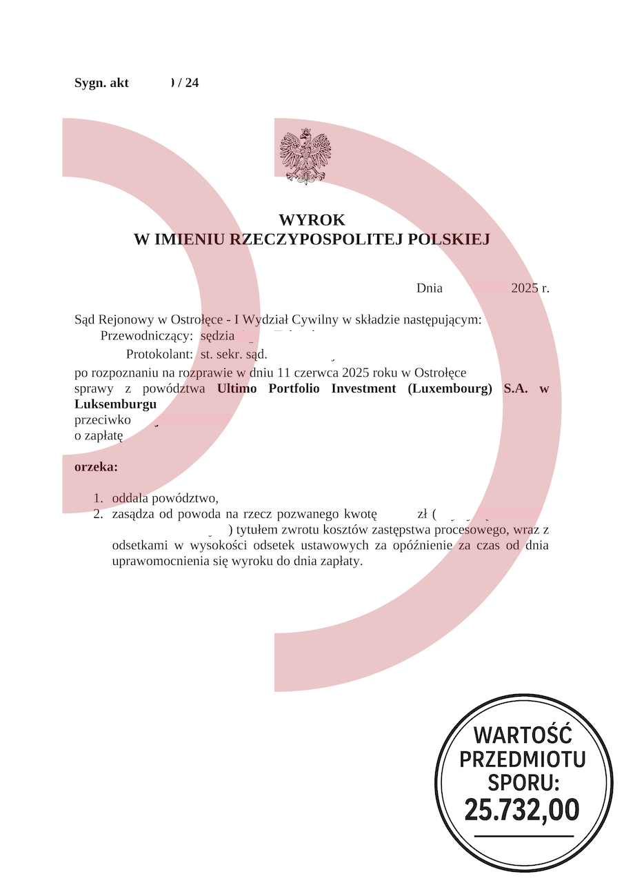 Uzyskany efekt: Powództwo oddalone w całości, brak odsetek, brak kosztów procesu.
