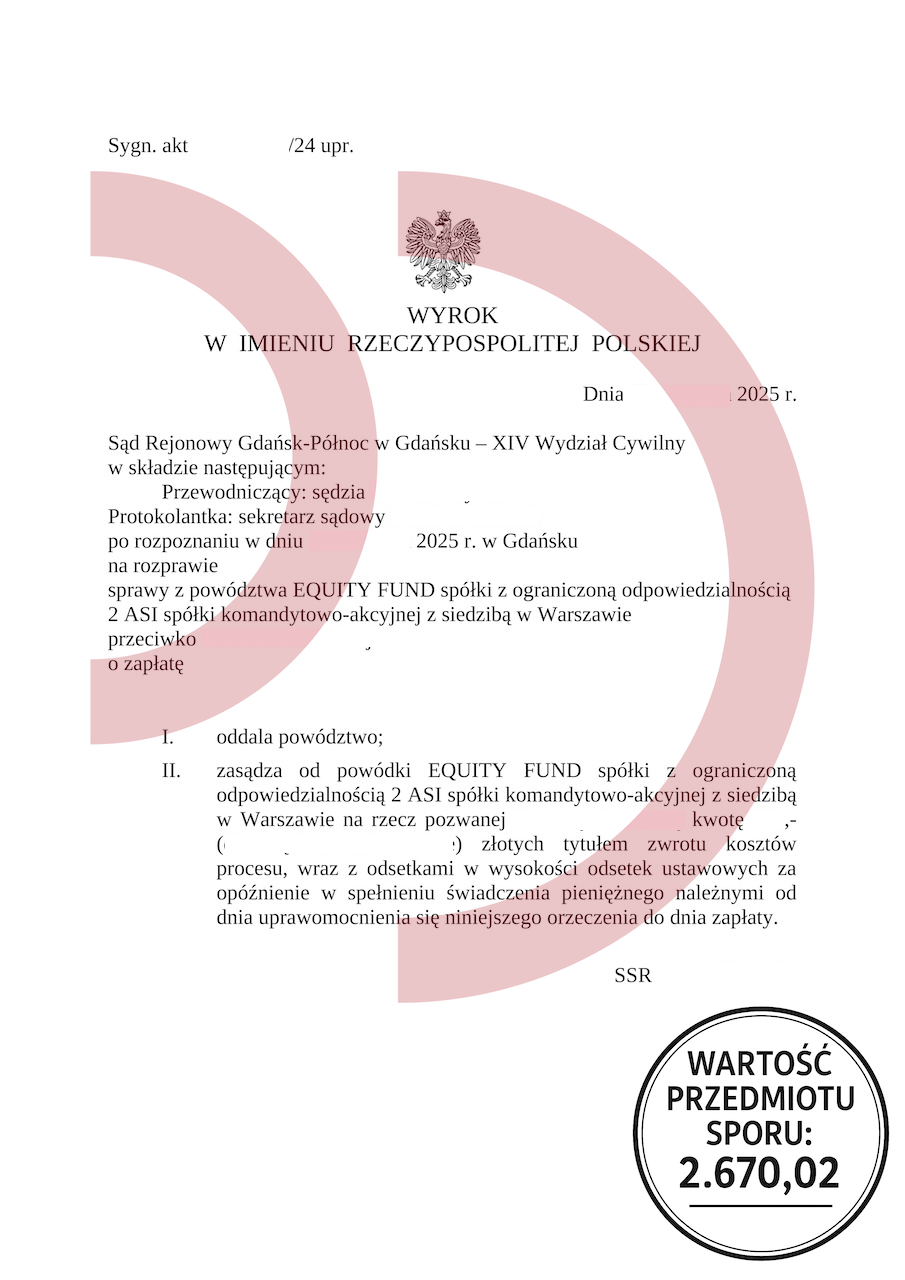 Uzyskany efekt: Powództwo oddalone w całości, brak odsetek, brak kosztów procesu