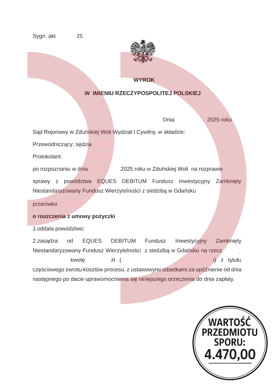 Uzyskany efekt: Powództwo oddalone w całości, brak odsetek, brak kosztów procesu