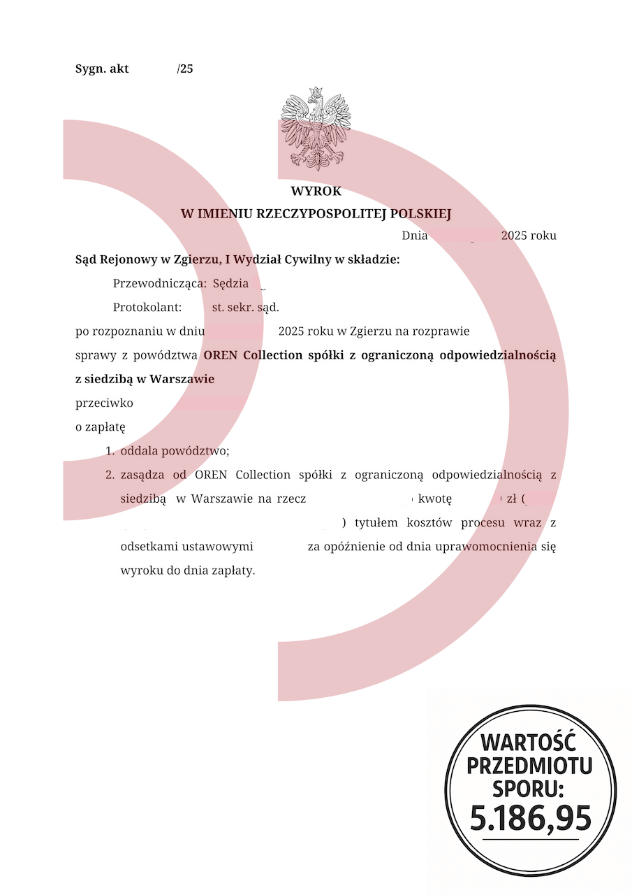 Uzyskany efekt: Powództwo oddalone w całości, brak odsetek, brak kosztów procesu.