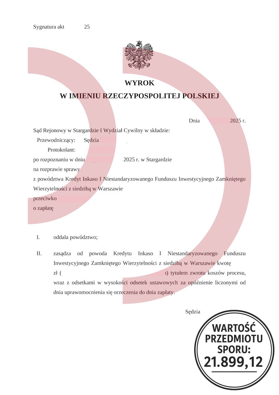 Uzyskany efekt: Powództwo oddalone w całości, brak odsetek, brak kosztów procesu