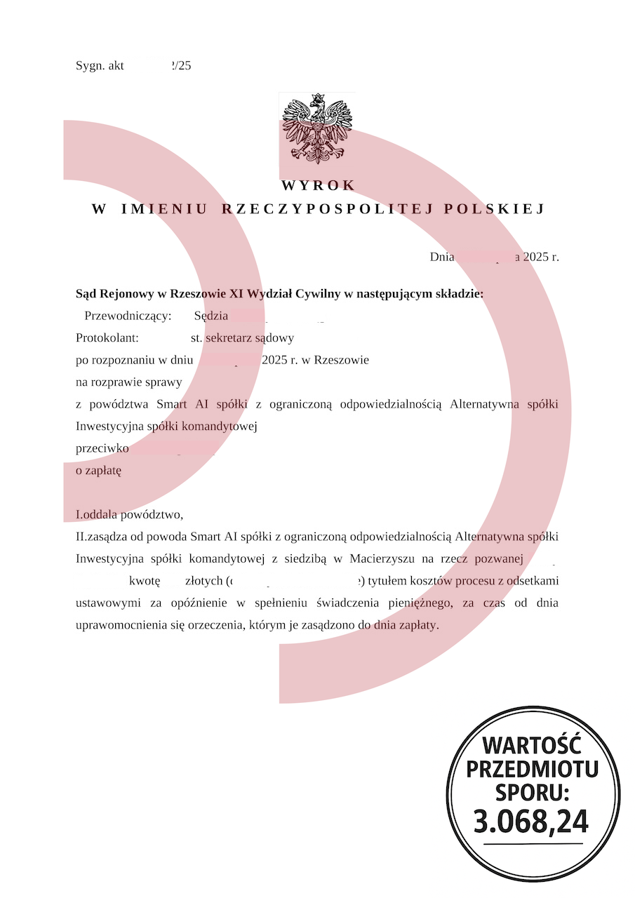 Uzyskany efekt: Powództwo oddalone w całości, brak odsetek, brak kosztów procesu