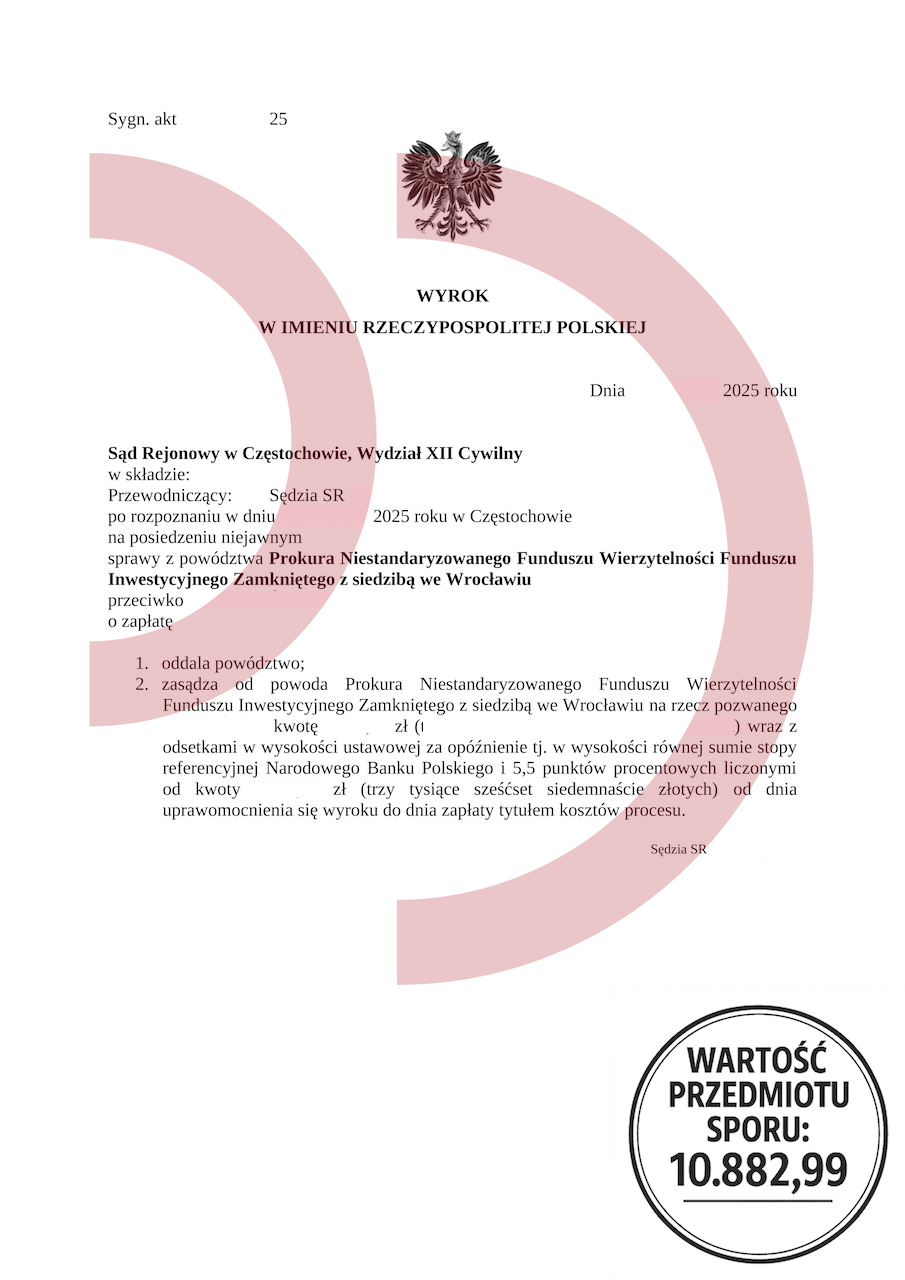 Najlepszym przykładem jest załączony wyrok dotyczący pozwu wniesionego przez Prokura Niestandaryzowany Fundusz Sekurytyzacyjny z Wrocławia. Wartość przedmiotu sporu wynosiła 10.882,99 zł, ale Sąd Rejonowy w Częstochowie oddalił powództwo w całości, jednocześnie zasądzając koszty procesu na rzecz pozwanego. Taki wynik pokazuje jasno, że zamiast podejmować decyzję o kolejnych zobowiązaniach, które często są wynikiem emocji, warto działać rozważnie i świadomie. Jeśli konsument podejmie walkę procesową, a pożyczkodawca nie przedstawi dowodów – sprawa może zostać wygrana.