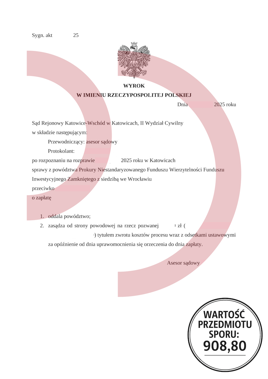 W czasach, gdy banki coraz częściej odmawiają przyznania finansowania, wielu konsumentów zaczyna szukać alternatyw. Wtedy pojawiają się oferty, które brzmią zbyt dobrze, by były prawdziwe – kredyty bez sprawdzania zdolności kredytowej, „pożyczki bez BIK” czy „gotówka od ręki”. Choć na pierwszy rzut oka wydają się ratunkiem, w rzeczywistości mogą prowadzić do jeszcze poważniejszych kłopotów finansowych. To właśnie od takich zobowiązań zaczyna się droga do zadłużenia, która często kończy się pozwem, a nawet egzekucją komorniczą. Na szczęście coraz więcej osób uświadamia sobie, że kredyty bez sprawdzania zdolności kredytowej nie są bezpiecznym rozwiązaniem. Przykładem może być sprawa rozpoznana przez Sąd Rejonowy Katowice-Wschód w Katowicach, gdzie powództwo złożone przez Prokurę Niestandaryzowany Sekurytyzacyjny Fundusz Inwestycyjny Zamknięty o zapłatę kwoty 908,80 zł zostało oddalone w całości. Sąd uznał, że roszczenie nie zostało udowodnione, a powód nie przedstawił wiarygodnych podstaw dochodzenia należności. To kolejny dowód na to, że nie każda pożyczka z reklamy jest zgodna z prawem, a konsumenci mają realne szanse na obronę swoich praw.