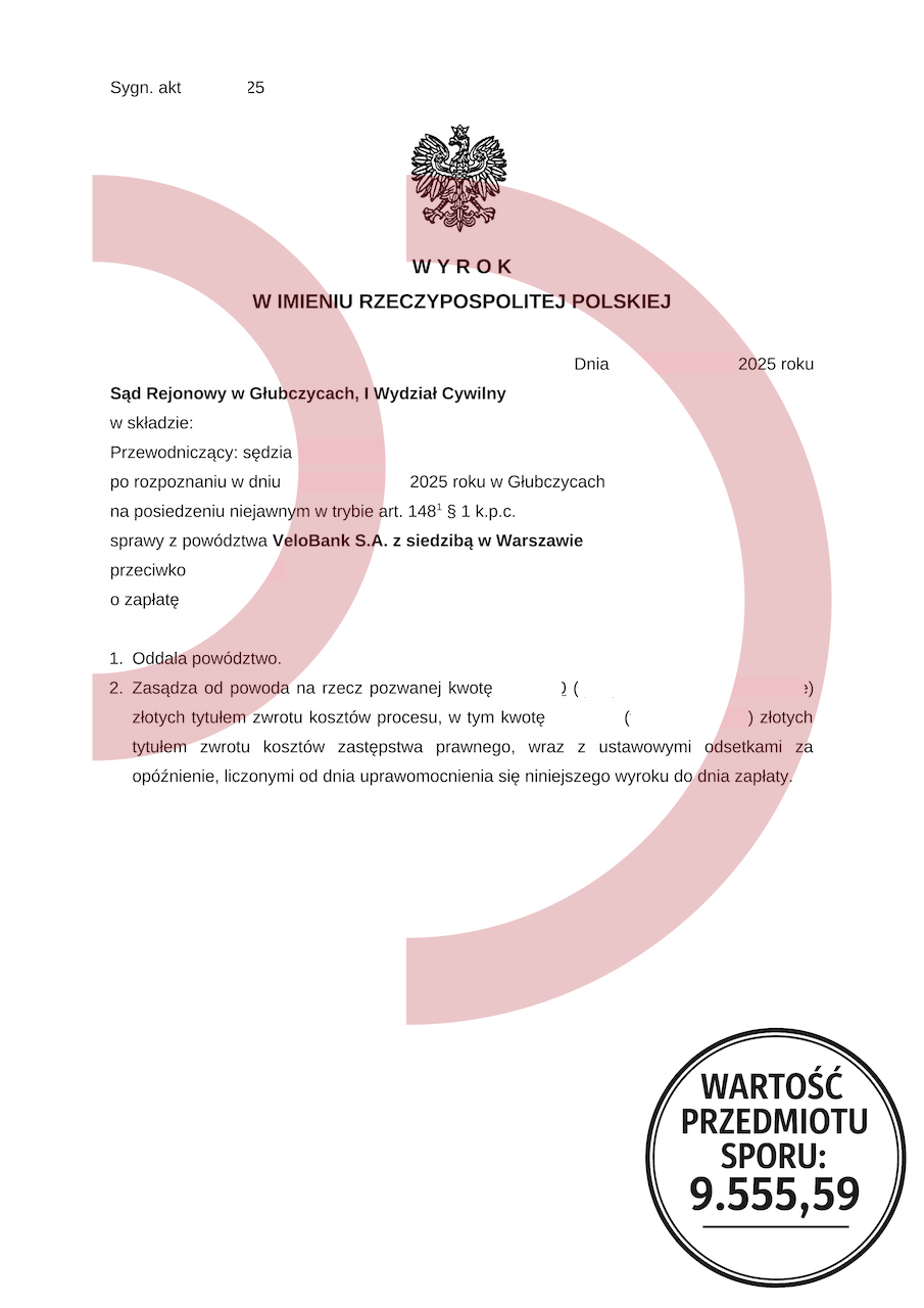 W czasach, gdy banki coraz dokładniej analizują zdolność kredytową klientów, hasła typu „pożyczka bez BIK”, „kredyt bez zdolności” czy „pieniądze w 15 minut” brzmią kusząco. Jednak za tą pozorną łatwością często kryje się ryzyko, którego konsekwencje mogą ciągnąć się latami. Dlatego dziś przyglądamy się tematowi kredytów bez zdolności kredytowej w VeloBank – i wyjaśniamy, na co trzeba uważać oraz jak się bronić, gdy bank lub pożyczkodawca wystąpi do sądu. Świetnym przykładem jest sprawa rozpoznana przez Sąd Rejonowy w Głubczycach, który oddalił powództwo VeloBank S.A. o zapłatę kwoty 9.555,59 zł. To kolejne potwierdzenie, że w wielu przypadkach umowy zawierane przez instytucje finansowe mogą być skutecznie podważane – zwłaszcza gdy kredyt udzielony był osobie bez realnej zdolności kredytowej.