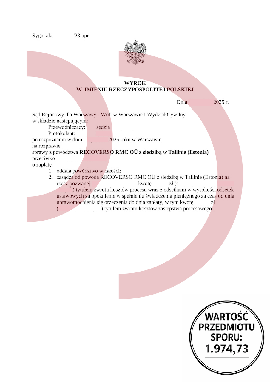 Uzyskany efekt: Powództwo oddalone w całości, brak odsetek, brak kosztów procesu.