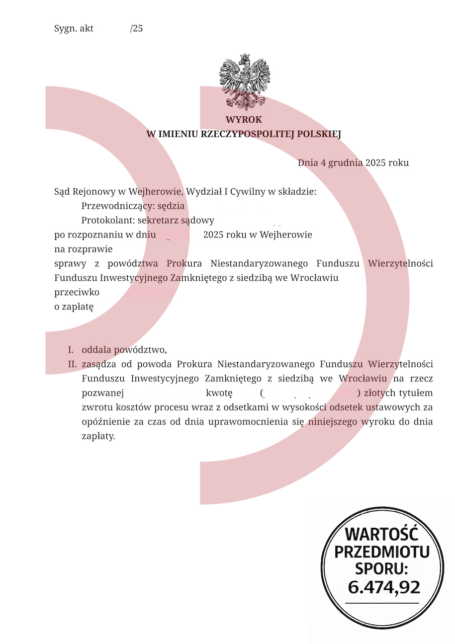 Uzyskany efekt: Powództwo oddalone w całości, brak odsetek, brak kosztów procesu.