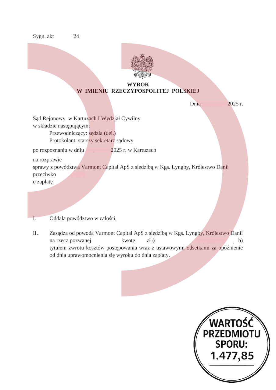 Uzyskany efekt: Powództwo oddalone w całości, brak odsetek, brak kosztów procesu