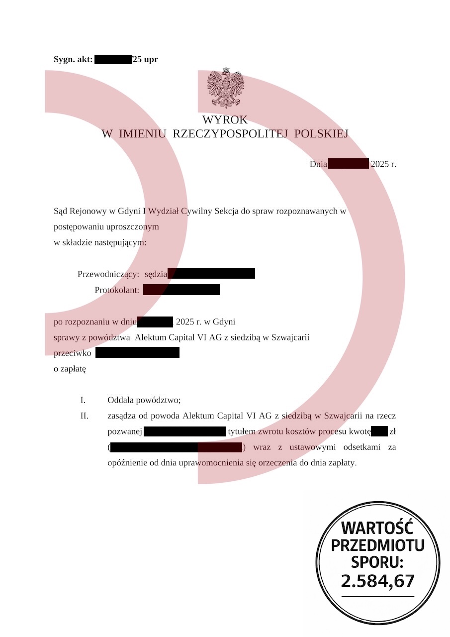 Uzyskany efekt: Powództwo oddalone w całości, brak odsetek, brak kosztów procesu