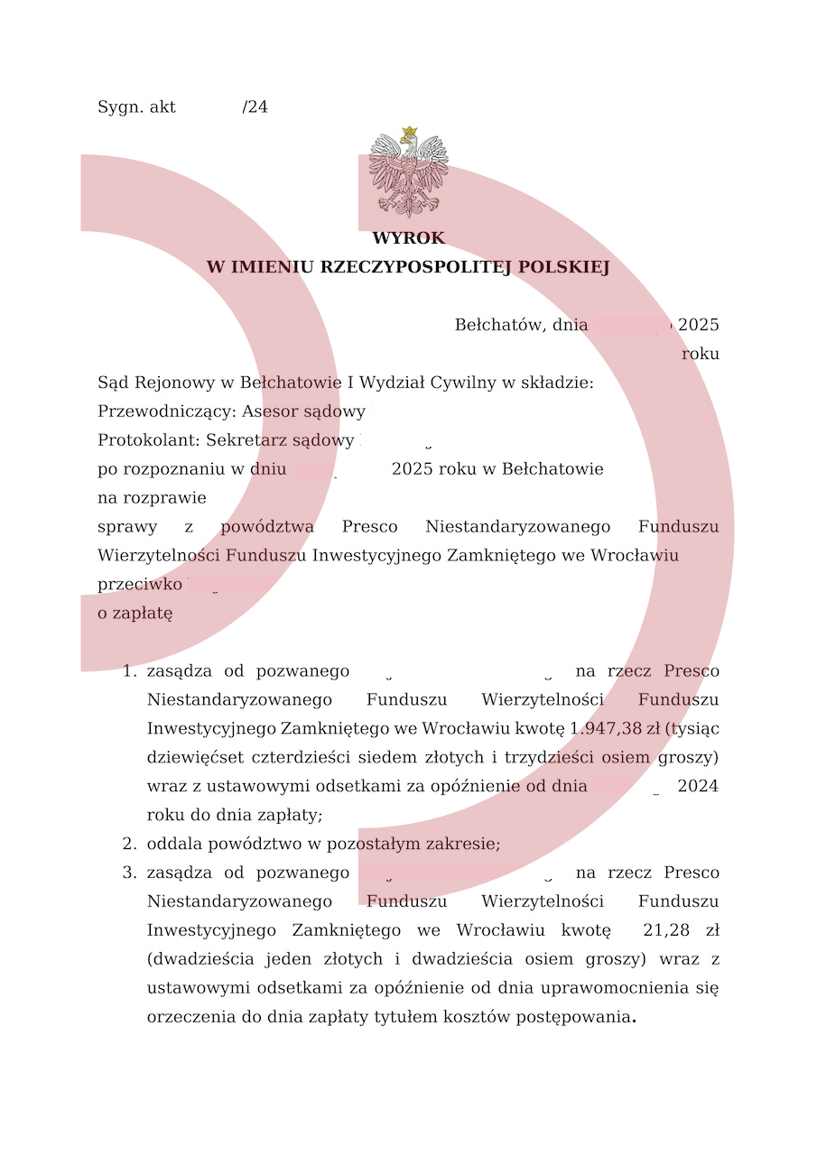 Najlepszym dowodem na to, że wiemy, jak skutecznie poradzić sobie z zaciągniętymi długami, jest nasza najnowsza wygrana. Klient został pozwany przez firmę PRESCO, która dochodziła zapłaty kwoty 4.612,63 zł. Po wnikliwej analizie dokumentów i odpowiednim przygotowaniu obrony, sąd uznał nasze argumenty i zasądził jedynie 1.947,38 zł. Różnica to niemal 60% wartości pozwu – a klient uniknął również kosztów procesu, które w przeciwnym razie musiałby pokryć.