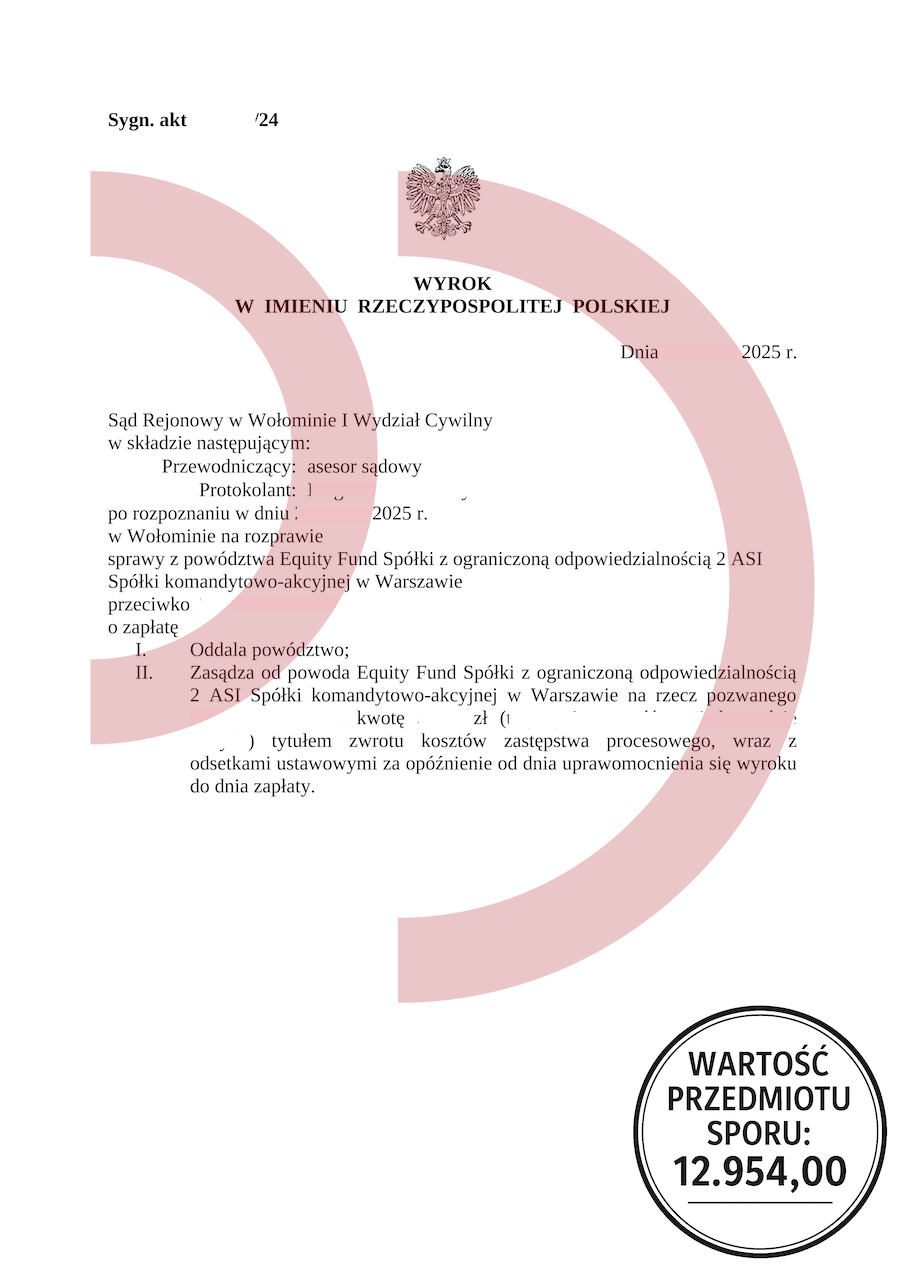 Uzyskany efekt: Powództwo oddalone w całości, brak odsetek, brak kosztów procesu