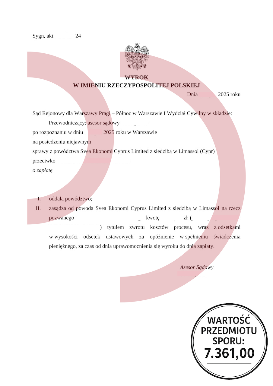 Uzyskany efekt: Powództwo oddalone w całości, brak odsetek, brak kosztów procesu.