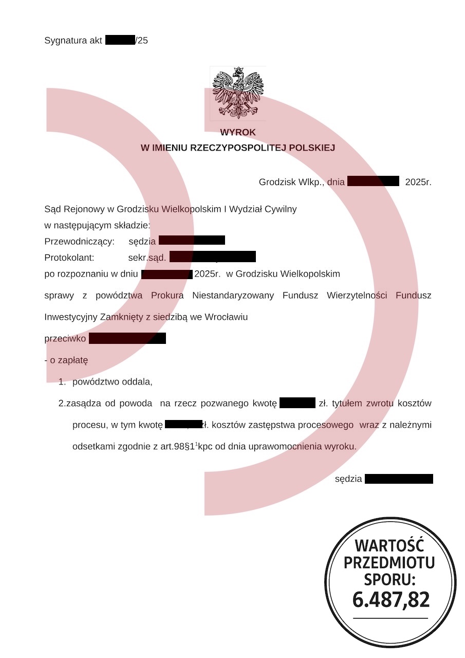 Uzyskany efekt: Powództwo oddalone w całości, brak odsetek, brak kosztów procesu