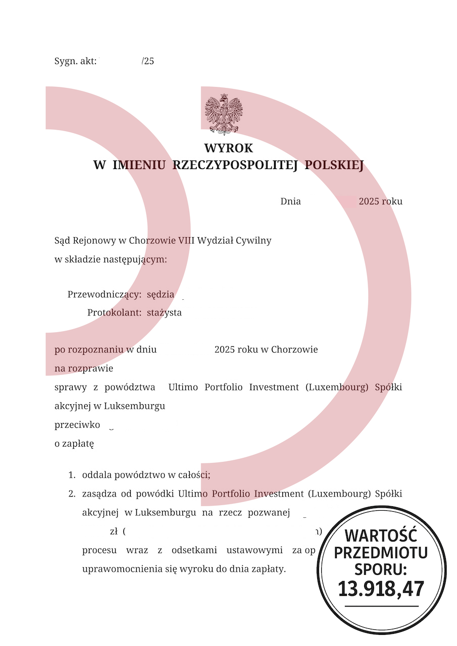 Dla wielu dłużników sąd kojarzy się z przegraną. Tymczasem profesjonalna pomoc dłużnikom w spłacie zobowiązań pokazuje, że to właśnie tam kończy się strach. Kancelaria Oddłużeniowa Łukasza Białkowskiego przygotowała mocną obronę, wskazała błędy w umowie i wykazała, że wierzyciel działał niezgodnie z przepisami. Sąd przyznał rację klientce – oddalił powództwo w całości.