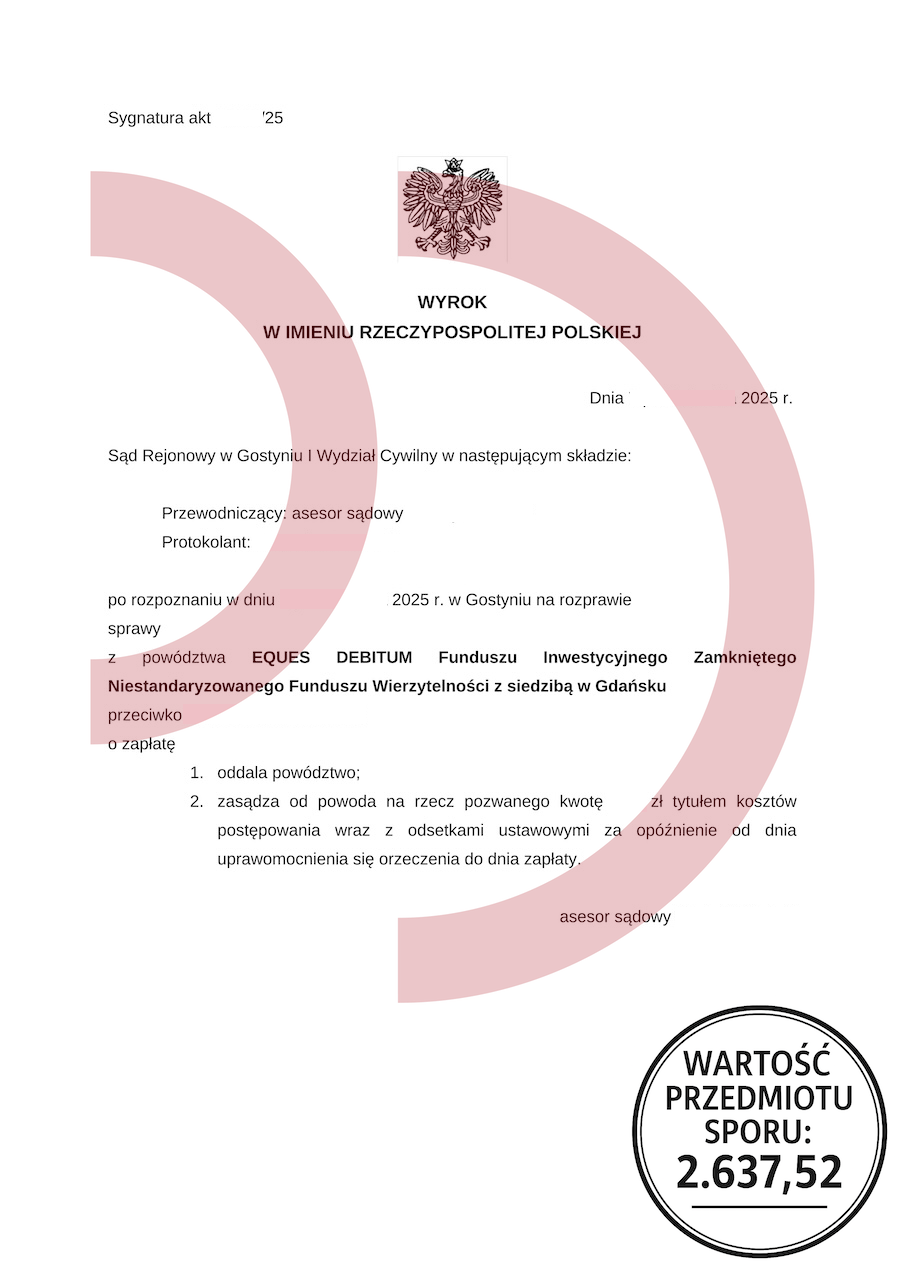 Uzyskany efekt: Powództwo oddalone w całości, brak odsetek, brak kosztów procesu.